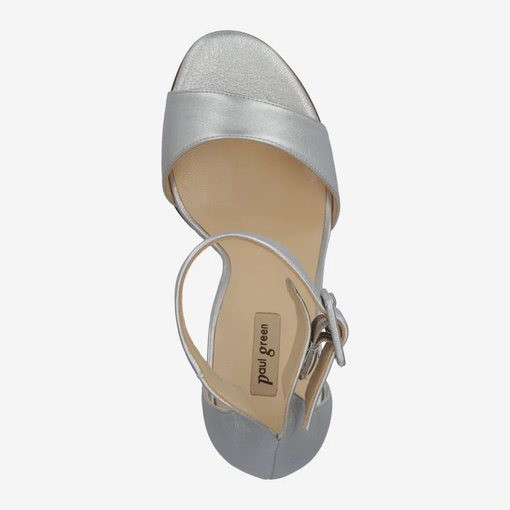 Ein hinreißendes Paar für Ihren exklusiven Anlass sind diese Riemchen-Sandaletten von Paul Green. Das extravagante Modell präsentiert sich in silbernem Metallicleder, einem schmalen Riemchen mit lederüberzogener Schließe und Druckknopf für rasches An- und Ausziehen. Der hohe Trichterabsatz setzt Ihre Füße atemberaubend in Szene. Durch und durch zauberhafte High-Heels für selbstbewusste Damen!