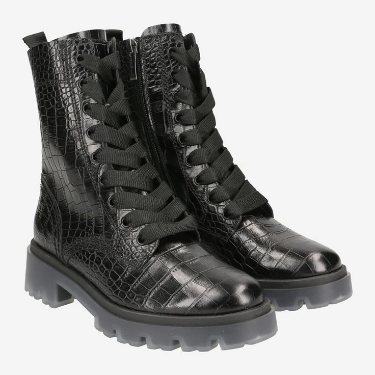 Mit diesen Boots feiern Sie den angesagten Animal-Look! Das schwarze Leder ist durch die Reptiloptik-Prägung besonders veredelt. Die Sohle in teil-transparenter Optik macht den Schuh einzigartig. Über den Reißverschluss ist der Einstieg kinderleicht, sodass Sie die Schnürung lediglich für Ihre individuelle Anpassung nutzen können.