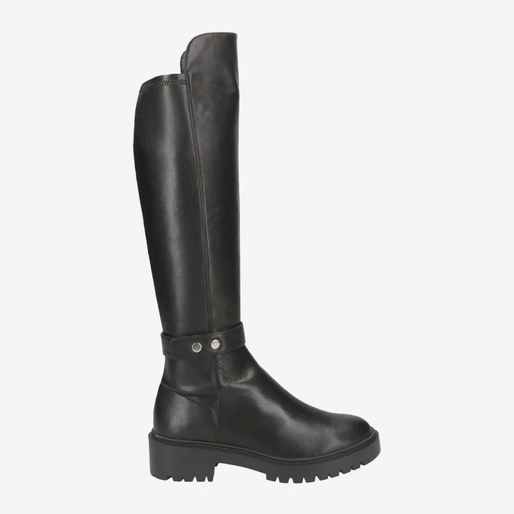 Kaum ein Kleidungsstück kann einen Look so wirkungsvoll verändern als ein Langschaftstiefel. Insofern ist dieser ein „Joker“ , ein absoluter Glücksgriff. Dieses Modell „Galve“ von Unisa ist elegant, verführerisch und stilsicher. Das schwarze Nappaleder ist kniehoch, wobei der Schnitt besonders raffiniert umgesetzt ist. Der breite Blockabsatz erhält durch den nietenverzierten Dekoriemen einen Hauch rockigen Charme, und bleibt dennoch klassisch und edel.